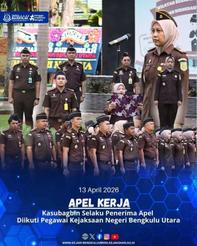Bertempat di halaman Kantor Kejaksaan Negeri Bengkulu Utara dilaksanakan Apel Kerja yang diikuti seluruh pegawai Kejaksaan Negeri Bengkulu Utara bertindak selaku penerima apel Kasubagbin Bengkulu Utara, Riza Oktari, S.H