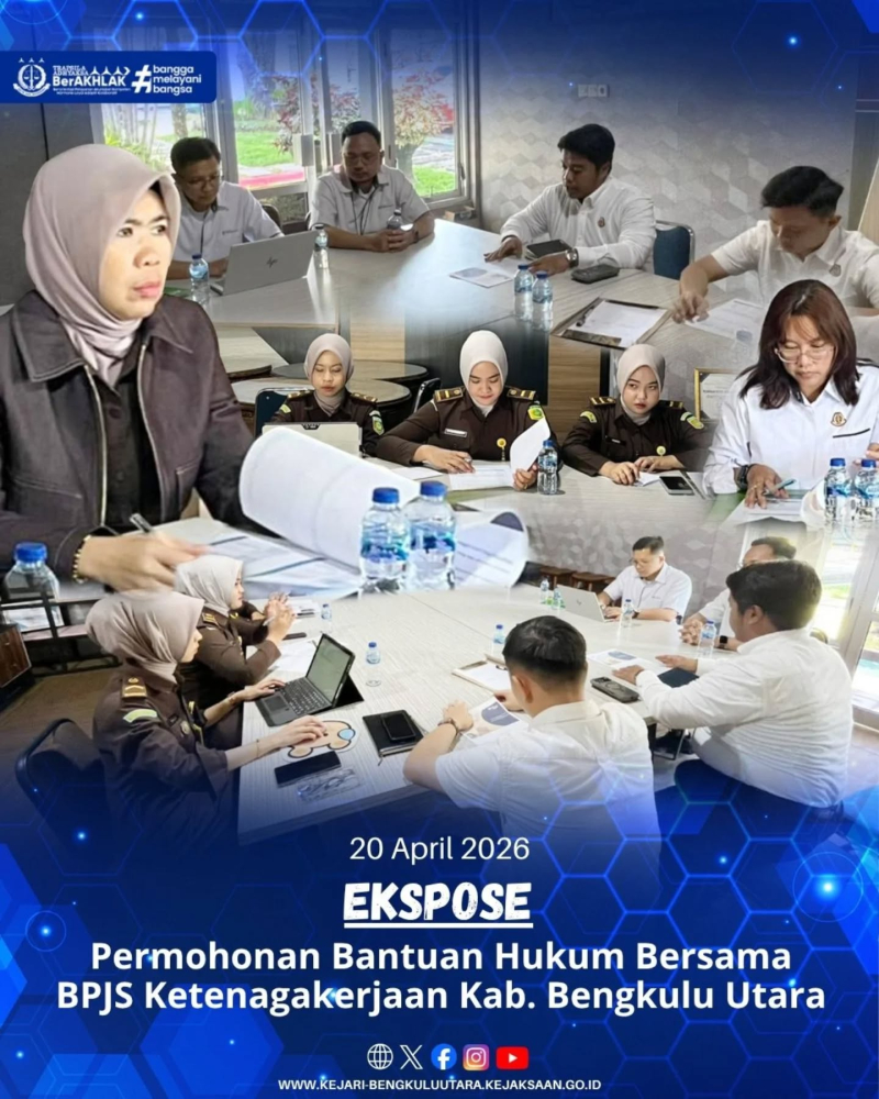 Kejaksaan Negeri Bengkulu Utara melakukan Kegiatan Ekspose Bantuan Hukum pada BPJS Ketenagakerjaan Kabupaten Bengkulu Utara, yang dihadiri oleh Kepala Kejaksaan Negeri Bengkulu Utara Nurmalina Hadjar, S.H., M.H., Kepala Seksi Perdata dan Tata Usaha Negara Netanya Margareth, S.H., M.H., Kasubsi, dan Jajaran Datun, Bersama BPJS Ketenagakerjaan Kabupaten Bengkulu Utara bertempat di Aula Kejaksaan Negeri Bengkulu Utara