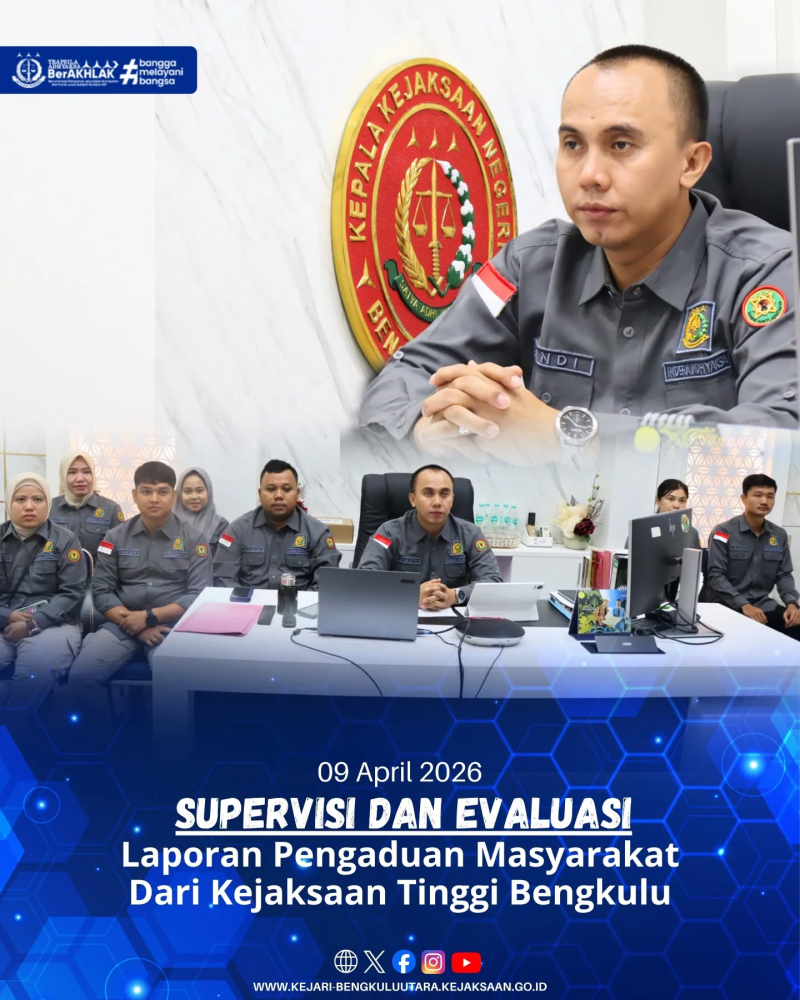 Bidang Intelijen pada Kejaksaan Negeri Bengkulu Utara telah mengikuti kegiatan rapat virtual melalui Zoom Meeting yang diselenggarakan oleh Kejaksaan Tinggi Bengkulu. Kegiatan tersebut merupakan bagian dari supervisi dan evaluasi terhadap laporan pengaduan masyarakat yang menjadi salah satu instrumen penting dalam mendukung transparansi dan akuntabilitas kinerja institusi kejaksaan.